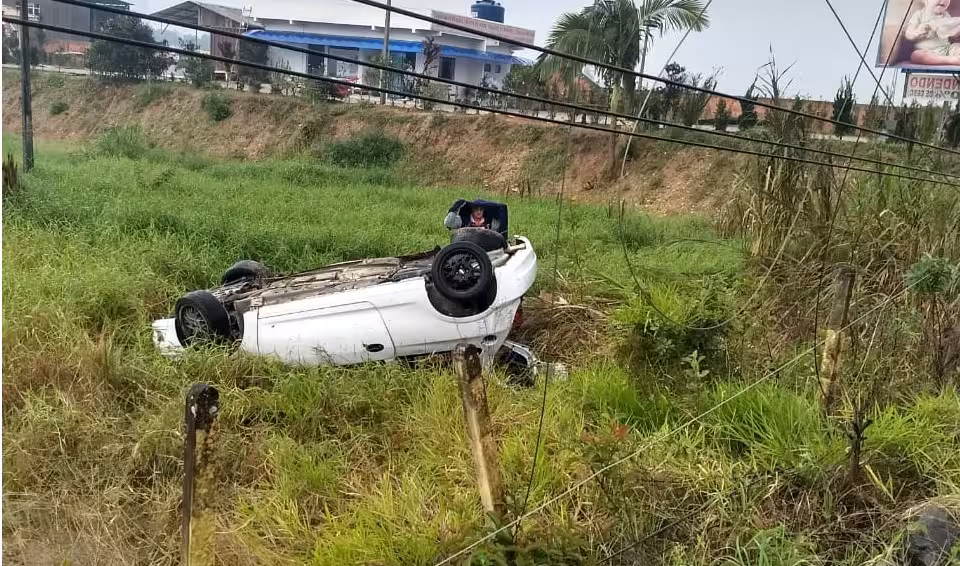 Um homem capotou com um Celta branco na rodovia Antônio Heil, no bairro Brilhante. O acidente ocorreu por volta das 15h desta sexta-feira, 24, sentido Itajaí, cerca de 500 m após o trecho conhecido como "curva da morte".