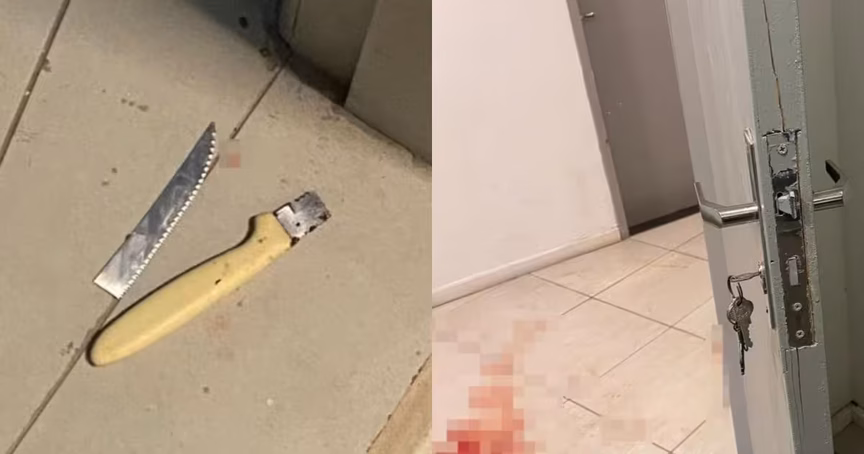 A faca utilizada no crime foi encontrada pela Polícia Militar dentro de um saco de lixo preto na cozinha do apartamento do agressor. O objeto foi recolhido e encaminhado à Central de Plantão Policial (CPP).