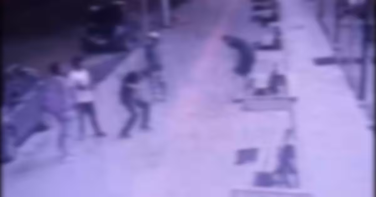 Imagem antes da briga registrada na avenida Marcos Konder. Na ocasião, os quatro homens estavam envolvidos na briga. O homem que aparece no vídeo, com um tipo de chapéu branco na cabeça, foi encontrado morto posteriormente.