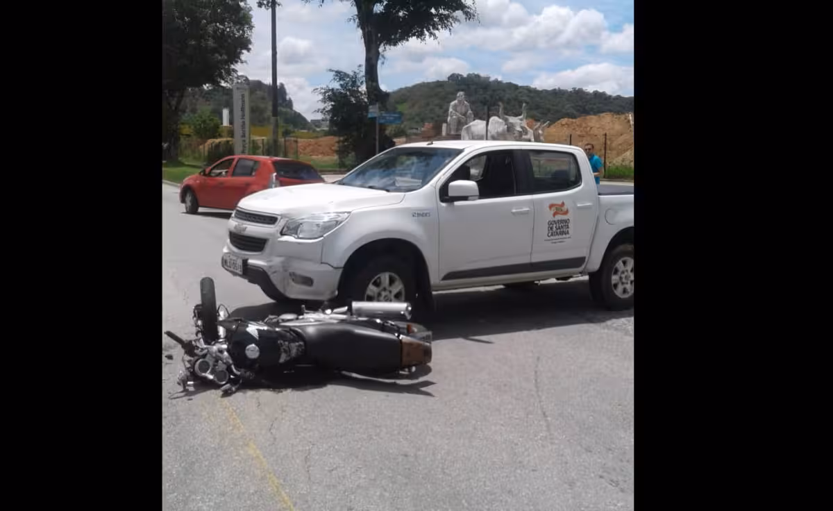 Um motociclista de 38 anos se feriu em acidente ocorrido no início da tarde desta terça-feira, 6, em uma colisão com um carro na avenida Beira Rio, próximo ao acesso ao Pavilhão Maria Celina Vidotto Imhof. O carro envolvido foi uma caminhonete Chevrolet, pertencente ao governo de Santa Catarina.