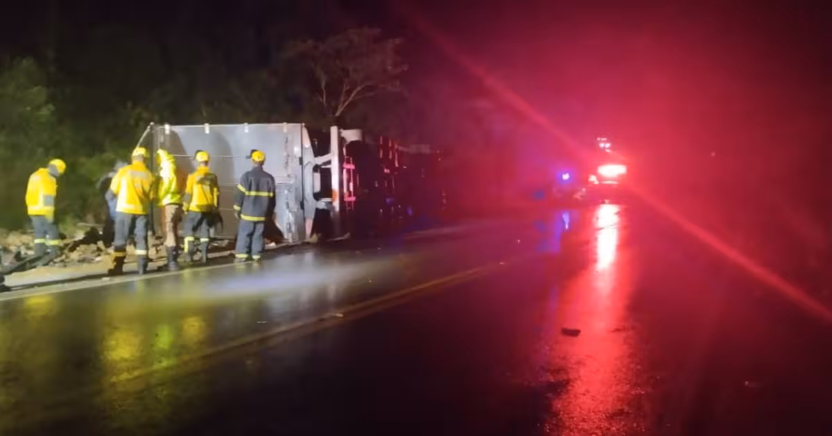 De acordo com a Polícia Militar Rodoviária (PMRv), a equipe foi acionada para o atendimento e, chegando no local, constatou que o caminhão acoplado com o semirreboque estava tombado fora da pista.