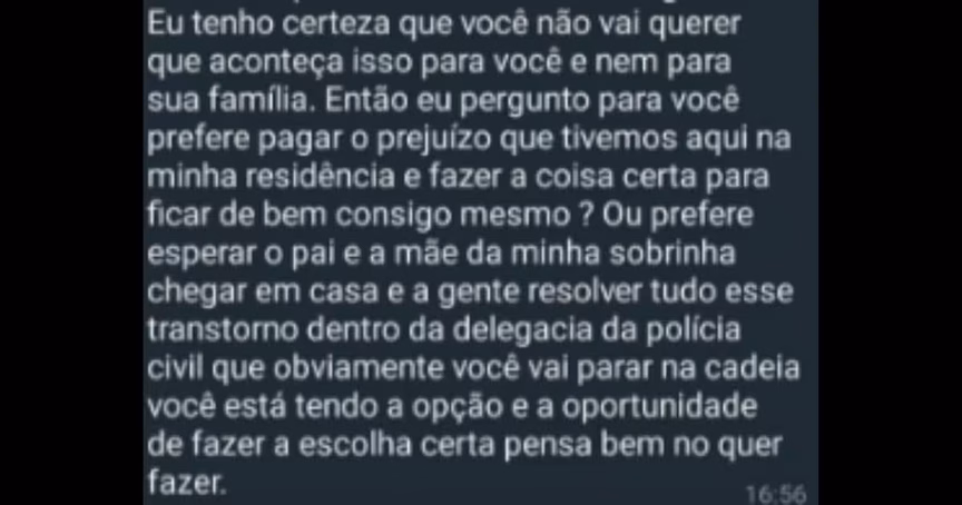 Entretanto, ele afirmou que estava disposto a resolver a situação sem procurar uma delegacia caso o homem pagasse o prejuízo que tiveram pelos dois computadores que ele tinha quebrado em “centenas e milhares de pedaços” por raiva, cerca de R$ 8 mil.