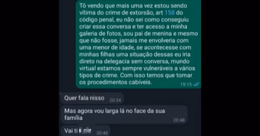 Jeferson só conseguiu ver as mensagens após o horário de trabalho e respondeu o golpista. Afirma que está sendo extorquido. “Depois que ele falou que ia mandar no Facebook da família, nem respondi mais nada. Outro apareceu depois se passando pela polícia”.