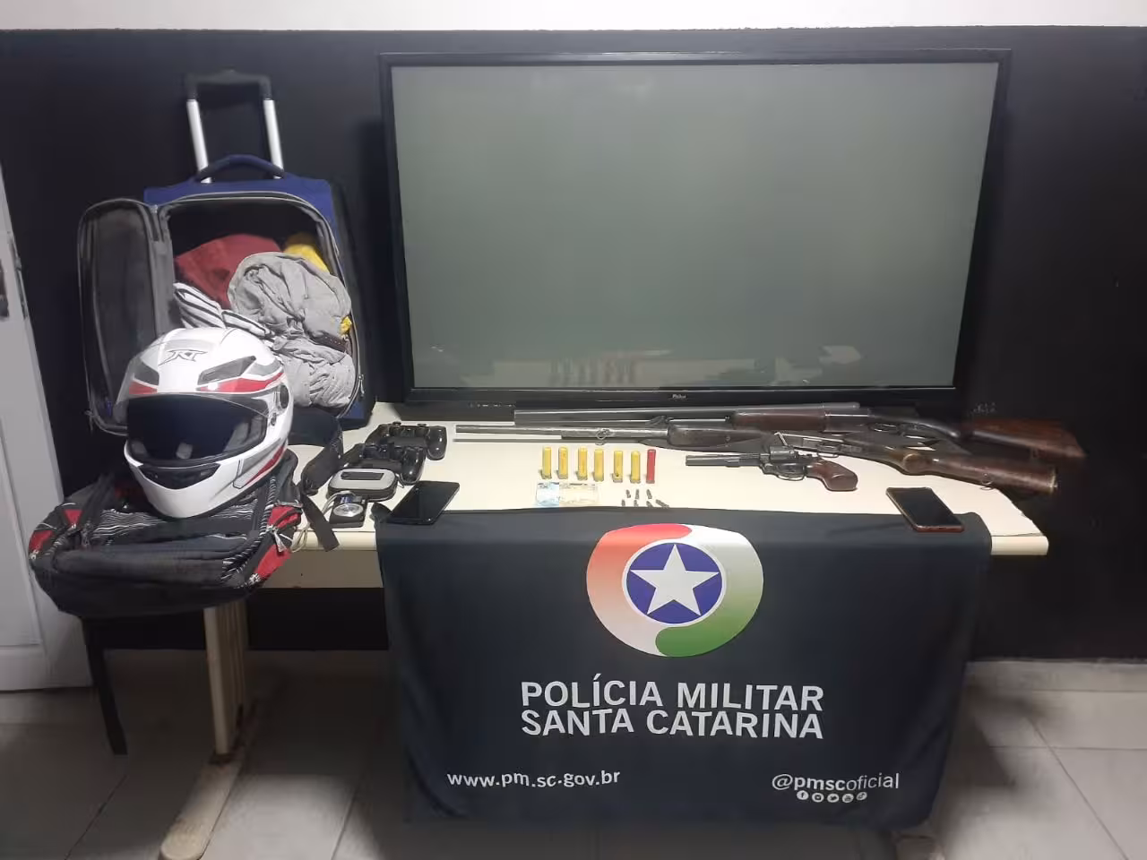 Foram apreendidos um revólver calibre 22, uma espingarda calibre 28 e uma espingarda calibre 12. Além disso, havia diversas munições de vários calibres e os objetos que foram roubados da residência.
