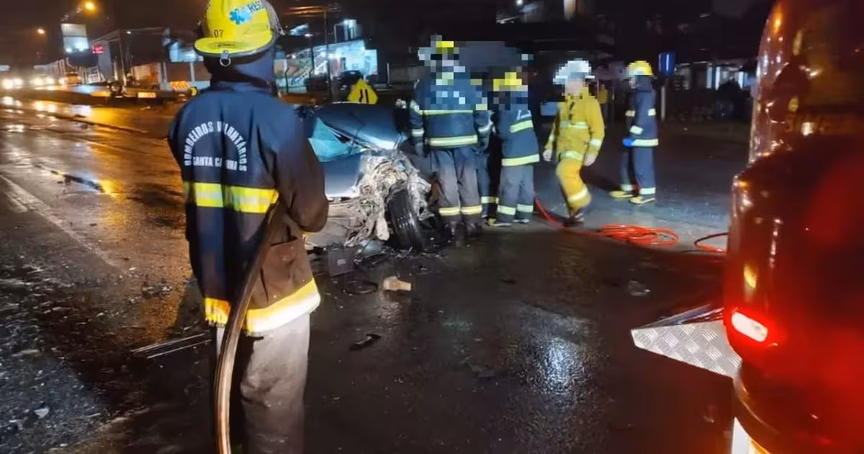 Célio estava preso às ferragens do carro Honda Civic, com placas de Blumenau. A equipe precisou seguir o protocolo de resgate para tirar o corpo da vítima do veículo.