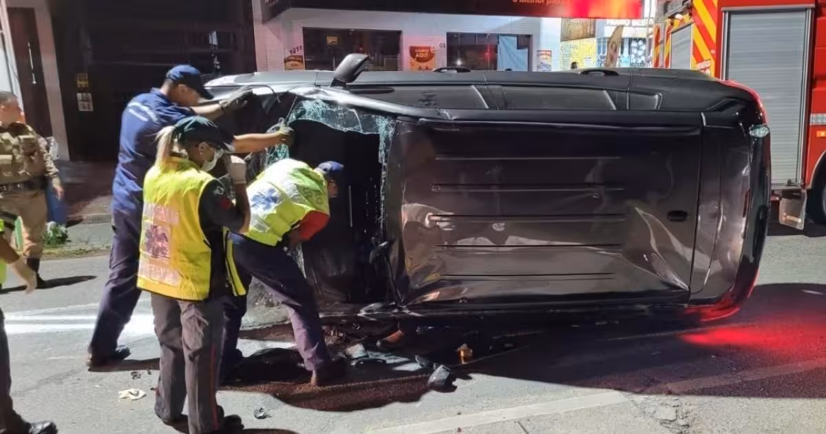 Logo, o motorista perdeu o controle do veículo, colidiu em dois carros estacionados e tombou. Os policiais deixaram claro que o condutor não apresentava nenhum sinal de embriaguez.