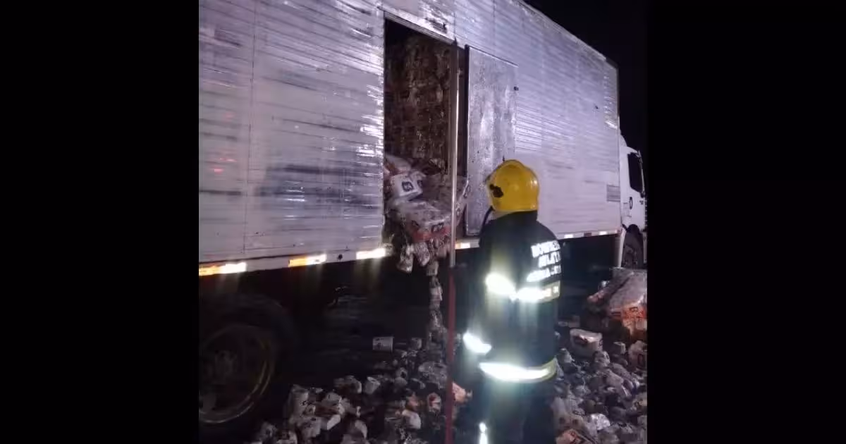 Veículo estava estacionado e chamas iniciaram no baú que transportava a carga