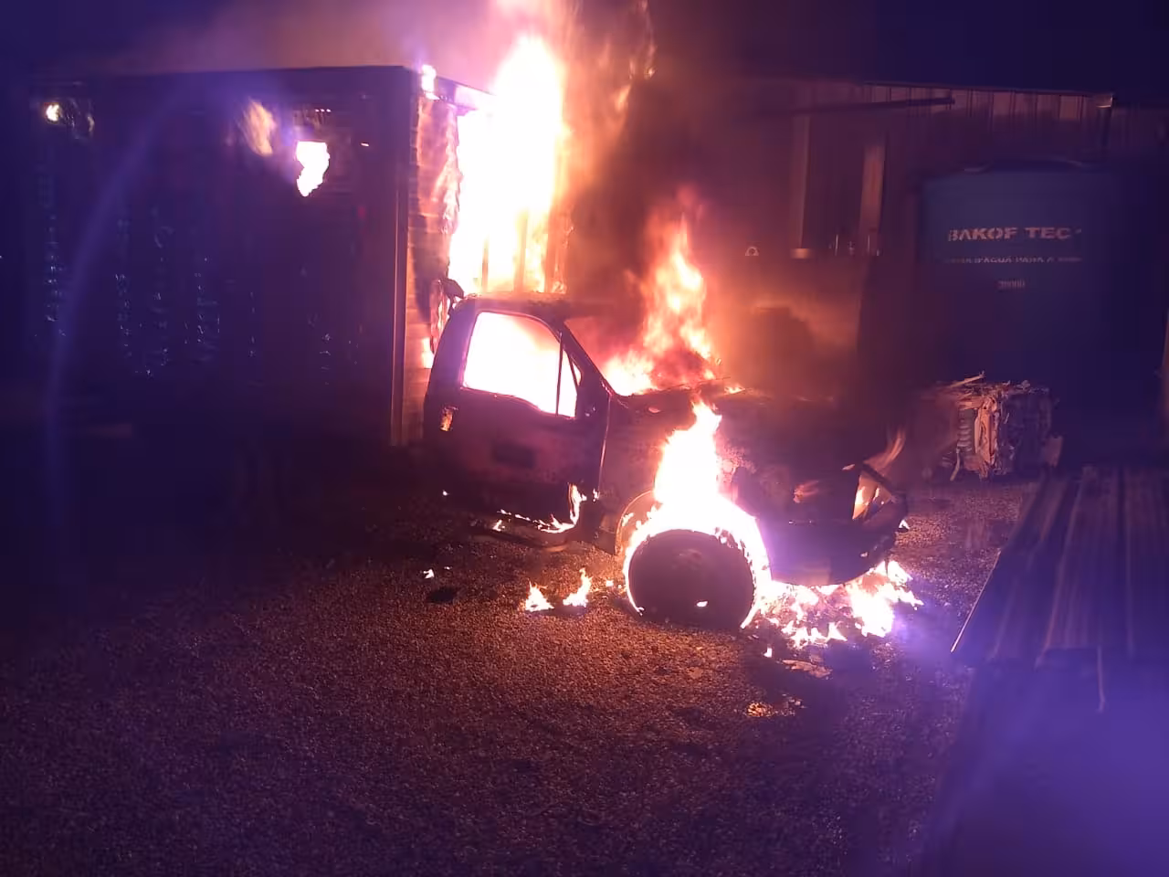 Os bombeiros agiram para o combate ao fogo do veículo e para o resfriamento de um reservatório de diesel com capacidade para 5 mil litros, que estava próximo. Conforme relato do proprietário, havia pelo menos 2,5 mil L no momento. Testemunhas afirmaram à equipe que o fogo começou após a queda de um raio.