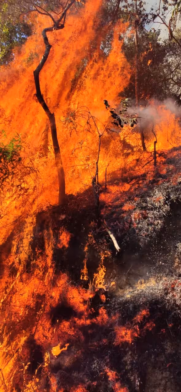 Como não havia perigo a residências, local de difícil acesso e a guarnição foi deslocada para atendimento de ocorrência prioritária, não foi realizado nenhum método de combate às chamas.