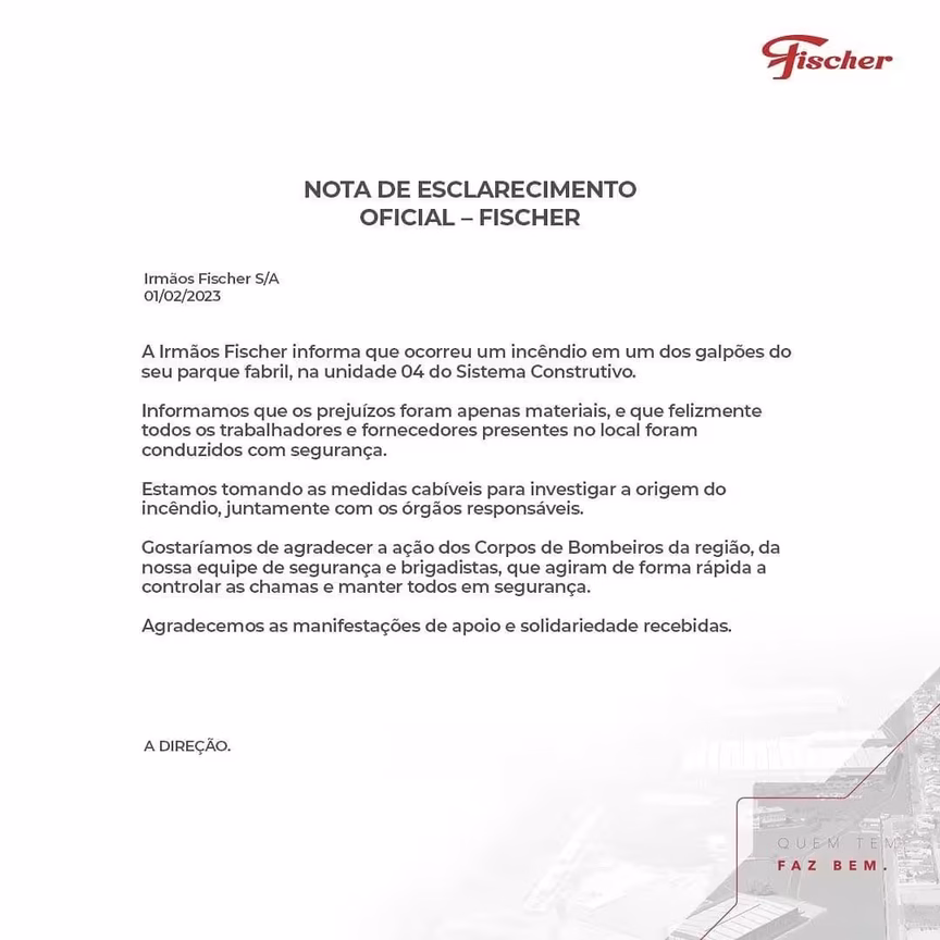 "A Irmãos Fischer informa que ocorreu um incêndio em um dos galpões do seu parque fabril, na unidade 04 do Sistema Construtivo.