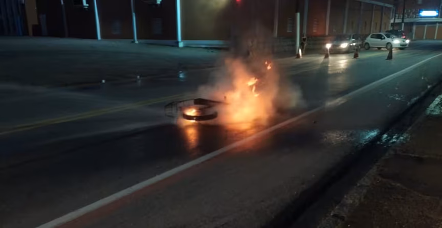 No local, a guarnição dos bombeiros se deparou com a moto Honda CG 150 Titan KS, com placas de Brusque, em chamas. O condutor, estava caído na rua, sem capacete e com politraumatismo, já sem sinais vitais.