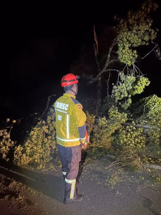 Na região de Canoinhas e Três Barras, equipes foram acionadas para diversas ocorrências de queda de árvores na BR-280 e em estradas locais. Em um dos atendimentos, em Valinhos, os bombeiros precisaram utilizar roupas de apicultor devido à presença de um enxame de abelhas, garantindo a segurança durante a remoção da árvore que bloqueava totalmente a via.