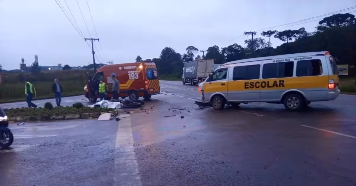 Um motociclista, de 37 anos, morreu após uma colisão frontal com uma van escolar na manhã desta terça-feira, 3, na SC-418, em São Bento do Sul, Norte de Santa Catarina.