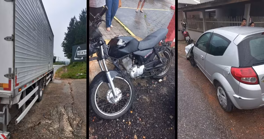 Motociclista fica gravemente ferido após acidente com carro e caminhão na Ivo Silveira, em Brusque