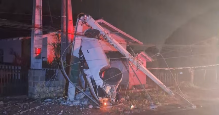 O poste foi destruído e fios caíram na pista. Bombeiros e Polícia Militar guardaram o local até a chegada da Celesc.