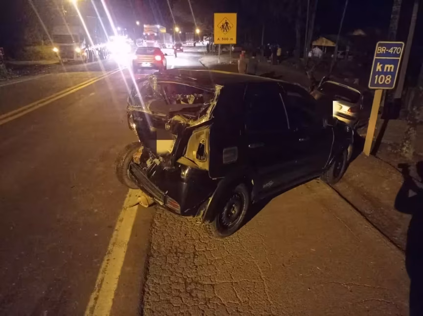 A PRF foi acionada para atender a colisão no quilômetro 108 por volta de 20h20. Ao chegarem no local, os policiais constataram o acidente envolvendo os carros Peugeot, com placas de Rio do Sul; o carro Fiat Palio Fire Flex, com placas de Apiúna; e o caminhão VW com placas de Indaial.