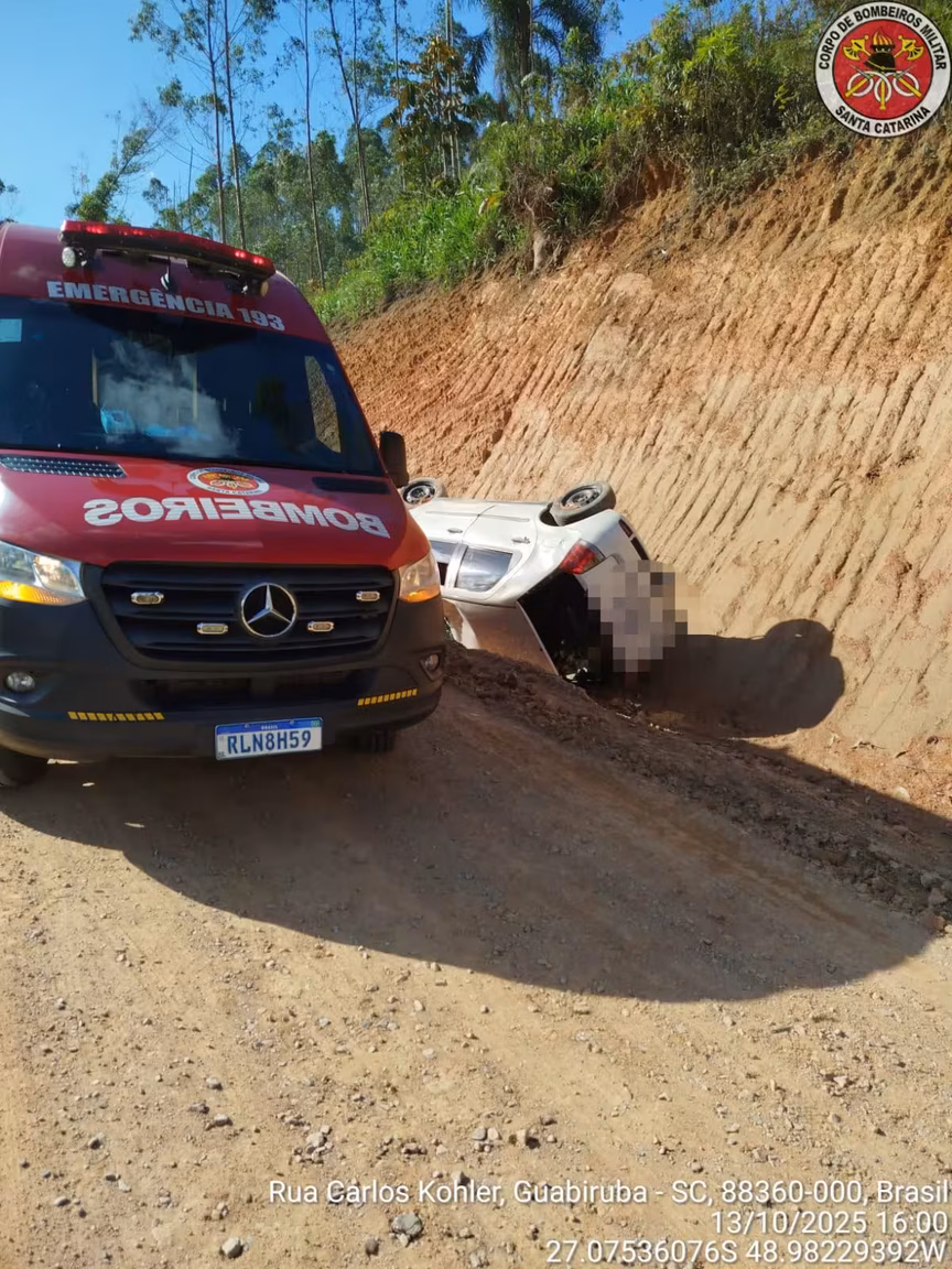 Motorista fica ferido após capotar carro em estrada de terra, em Guabiruba