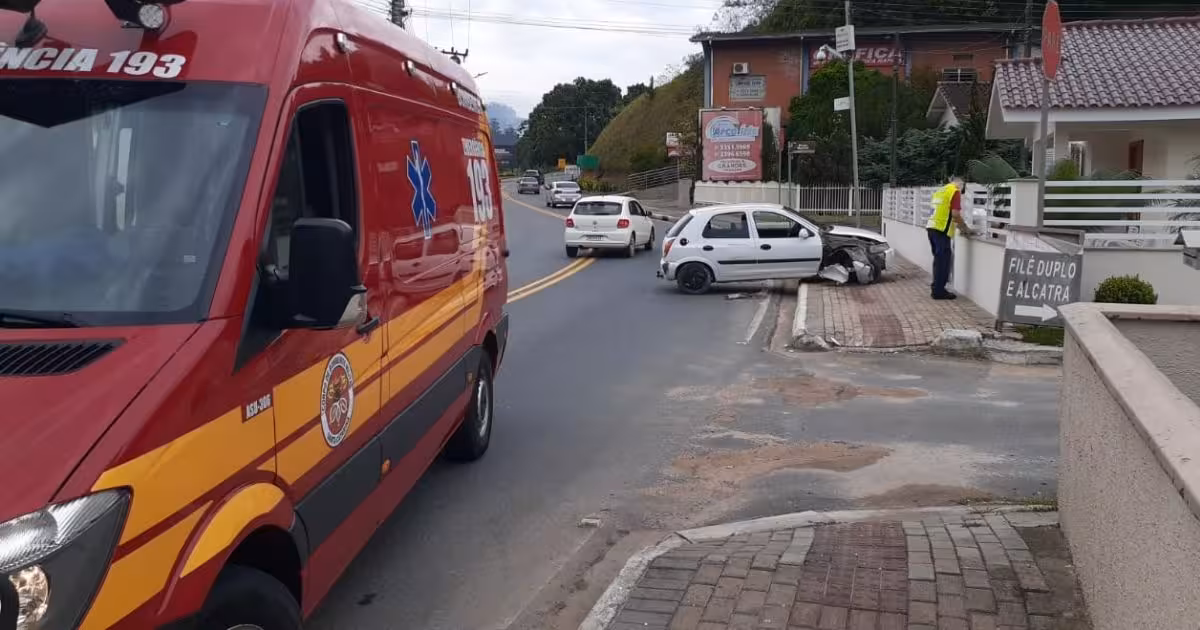 Um carro colidiu contra um muro por volta das 8h desta quinta-feira, 3, na Rua dos Imigrantes, no bairro Imigrantes, em Guabiruba. O acidente contou com o apoio do Corpo de Bombeiros.