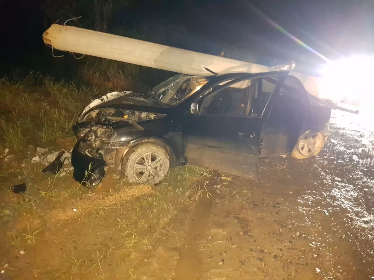 Um homem ficou ferido após o carro que ele dirigia colidir contra um poste e derrubá-lo na noite desta segunda-feira, 30, no bairro Guabiruba Sul, em Guabiruba.
