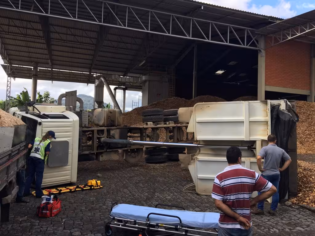 Com o acidente, o motorista, de 49 anos, ficou preso no interior da cabine e precisou ser retirado com ajuda do Corpo de Bombeiros.