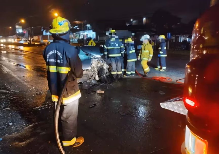 O homem estava preso às ferragens do carro Honda Civic, com placas de Blumenau. A equipe precisou seguir o protocolo de resgate para tirar o corpo da vítima do veículo.