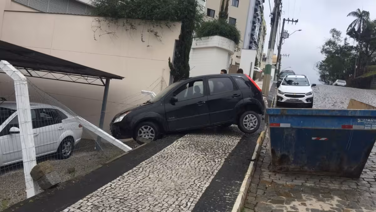 O motorista de um Ford Fiesta sofreu um acidente nesta quarta-feira, 4, na rua Mathilde Schaefer, Centro de Brusque, derrubando parte da cerca de uma revendedora de veículos.
