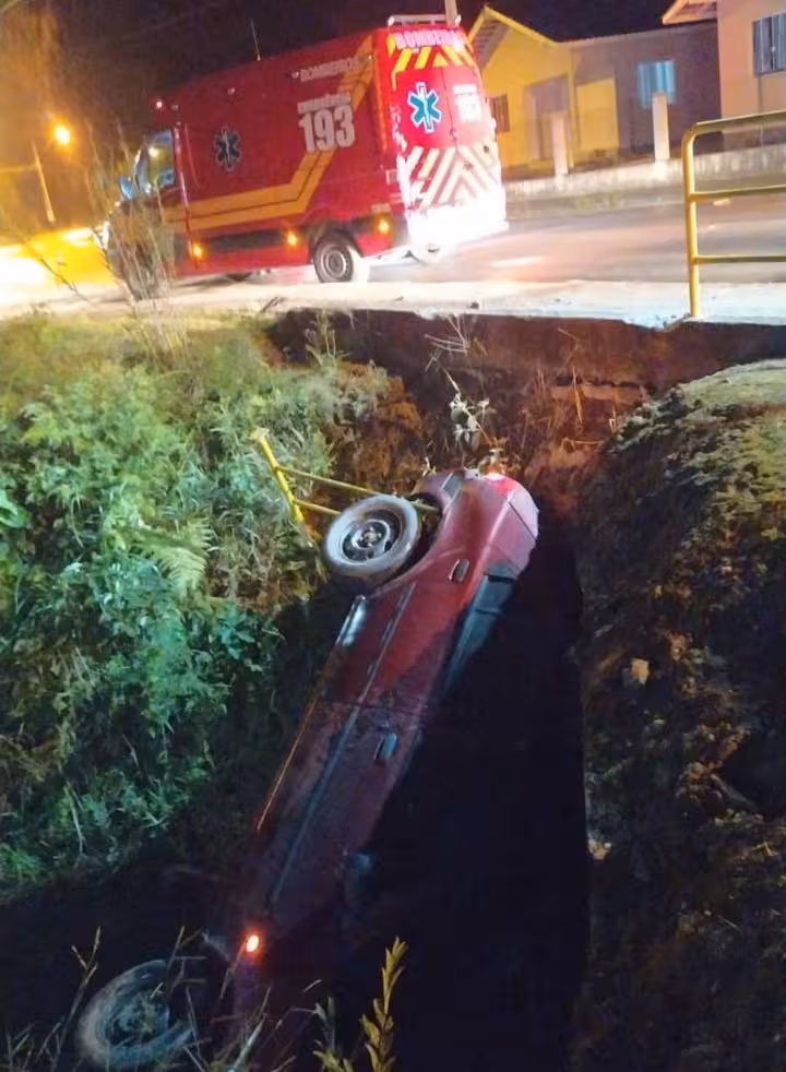 O Corpo de Bombeiros Militar atendeu a ocorrência por volta da meia-noite, na rua Sternathal. No local do acidente, o Ford Fiesta, de cor bordô, com placas de Guabiruba, estava capotado com a lateral esquerda dentro do ribeirão.