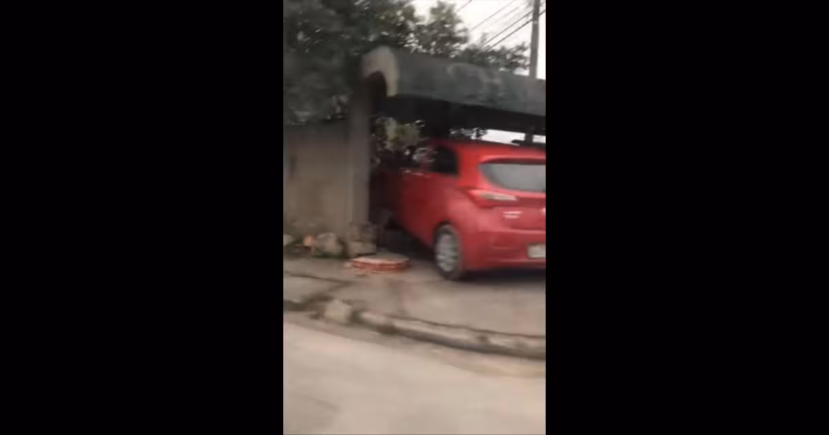 Algumas imagens compartilhadas nas redes sociais mostram uma parte de um veículo Hyundai/HB20 dentro do terreno de uma residência.