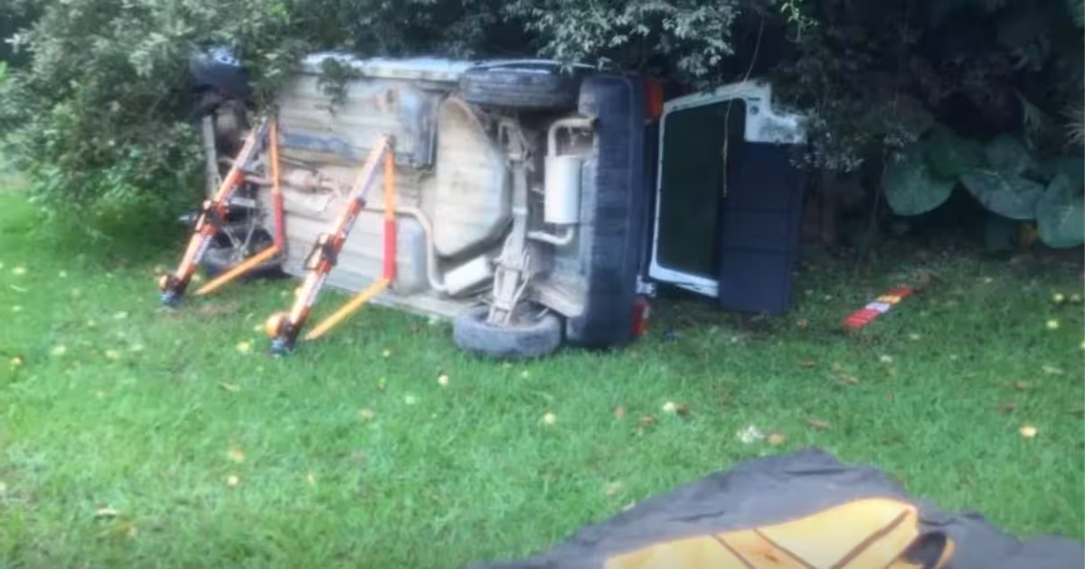 Quando os bombeiros chegaram no local, o veículo Fiat Uno Mille estava deitado com uma mulher no interior, presa na estrutura do carro.