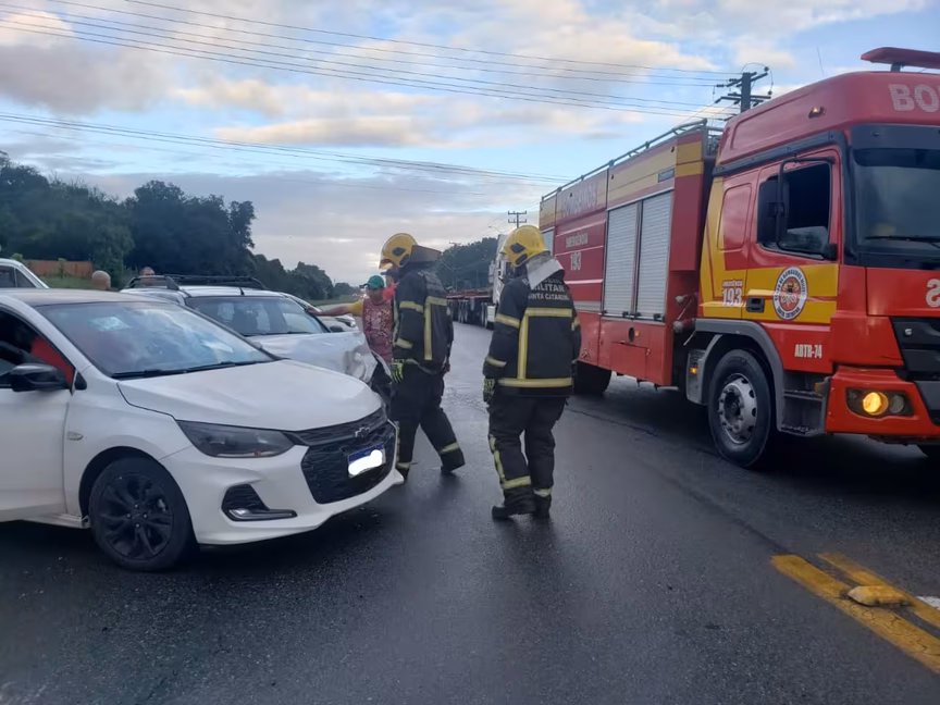 Uma mulher ficou presa às ferragens de um veiculo após uma colisão entre dois carros no bairro Areias Pequenas, em Araquari, no Norte catarinense, nesta sexta-feira, 17. O acidente aconteceu por volta das 7h.