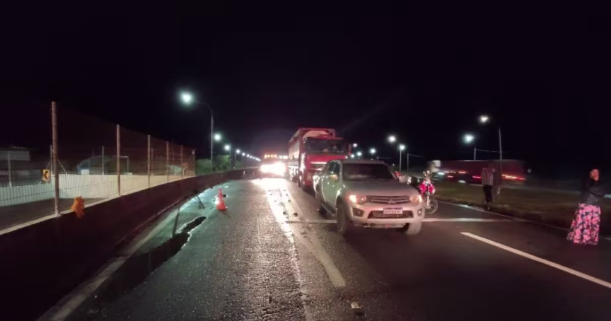 Mulher morre e criança fica gravemente ferida após serem atropeladas por moto e caminhão na BR-101, em Palhoça