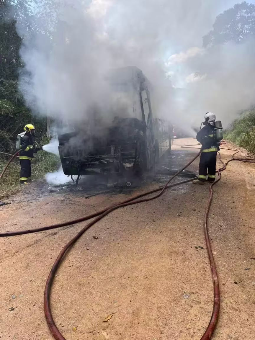 Ônibus intermunicipal fica totalmente destruído após incêndio no Vale do Itajaí