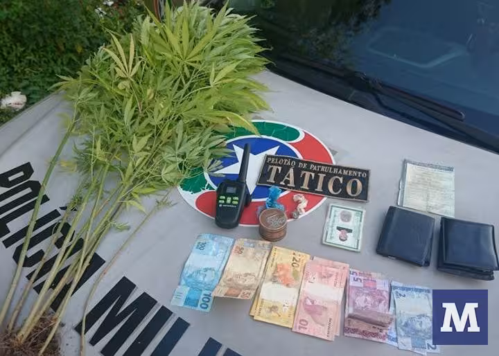 Foi apreendido, além das plantas, o rádio comunicador, a porção de maconha, dois aparelhos celulares e a quantia em dinheiro.