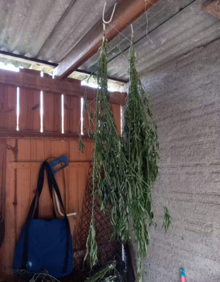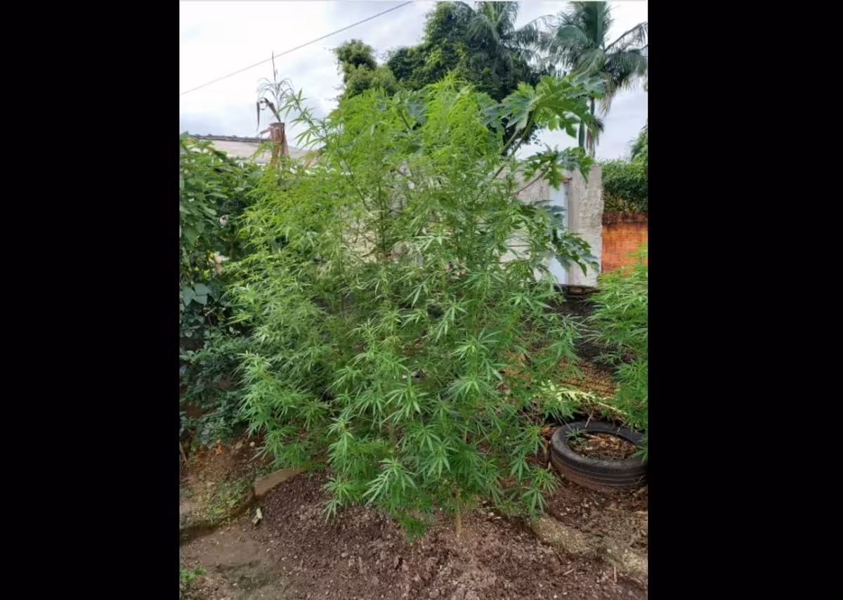 A PM encontrou oito pés de maconha plantados no quintal, cinco maços de maconha que estavam secando em um rancho ao lado da casa, além de 68 gramas da droga prontas para consumo e três potes com semestres da droga, que estavam em uma cômoda no quarto, totalizando 92 gramas. Os policiais também encontraram uma prensa no rancho e uma balança de precisão que estava em cima da geladeira.