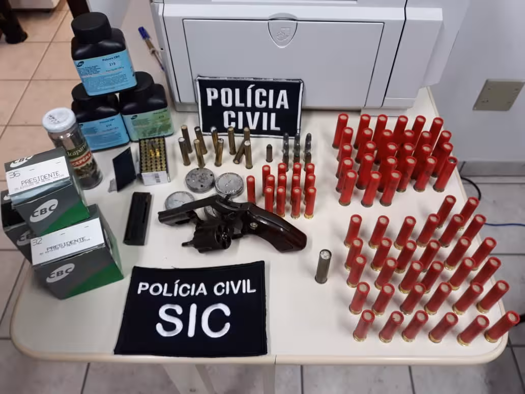 Foram apreendidos um revólver calibre .38, diversas munições de espingarda, munição de calibre .22 LR, acessórios para pistola e insumos para a produção de munição, como pólvora e espoletas.