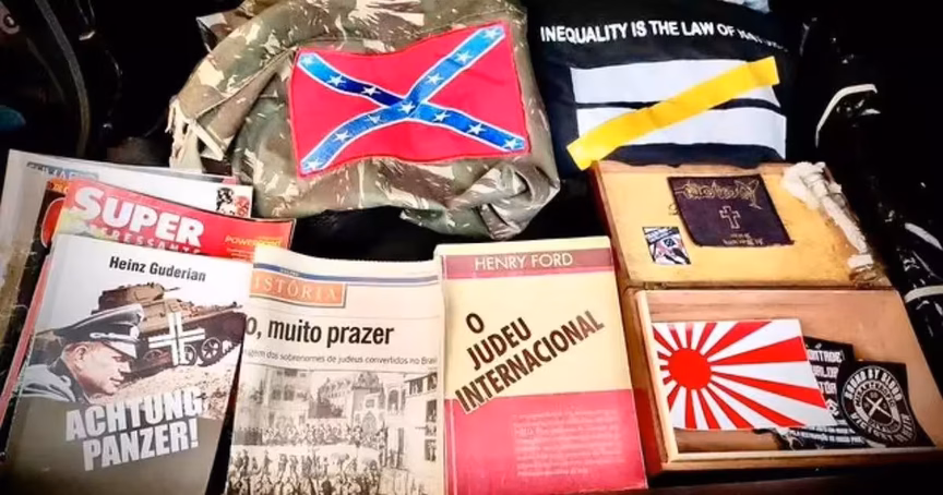 No local, os policiais apreenderam um celular, pertencente a um investigado, e diversos objetos de apologia ao nazismo, que serão analisados para a continuidade das investigações e identificação dos demais envolvidos.