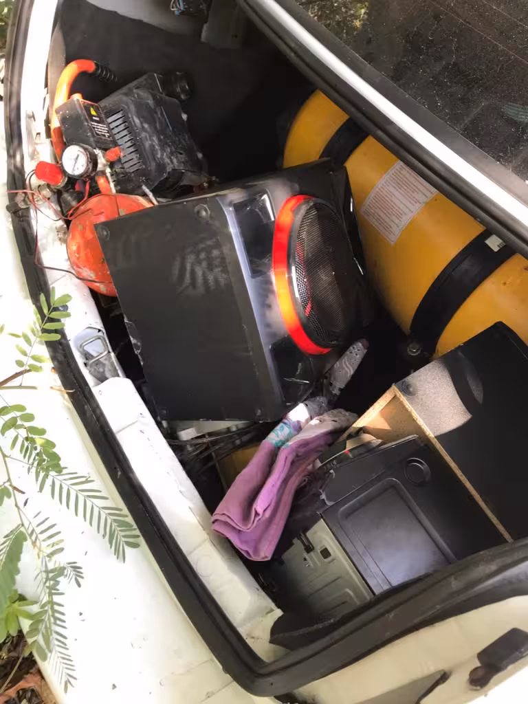 Os itens furtados ficaram no interior do veículo. Foram encontradas gaiolas de passarinho, televisores e uma caixa de som.
