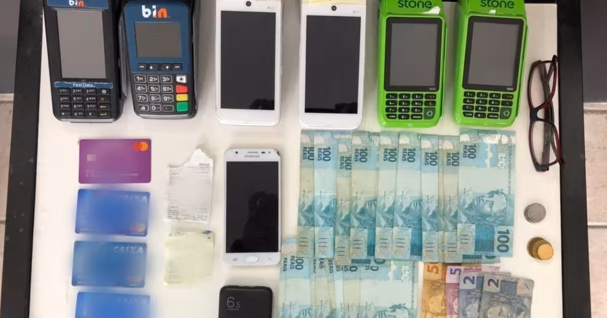 No quarto foram encontrados seis máquinas de cartão, quatro cartões, um celular e R$ 1.861 em espécie, além de três extratos de débitos nos valores de R$ 4999,99, R$ 4997,00 e R$ 4887,49.