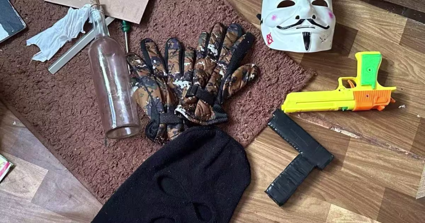 Entre os objetos encontrados, ainda segunda a polícia, estavam uma máscara, luvas, uma arma de brinquedo, uma garrafa preparada para ser um coquetel molotov, e um caderno contendo “detalhes meticulosos de um ato violento planejado”.