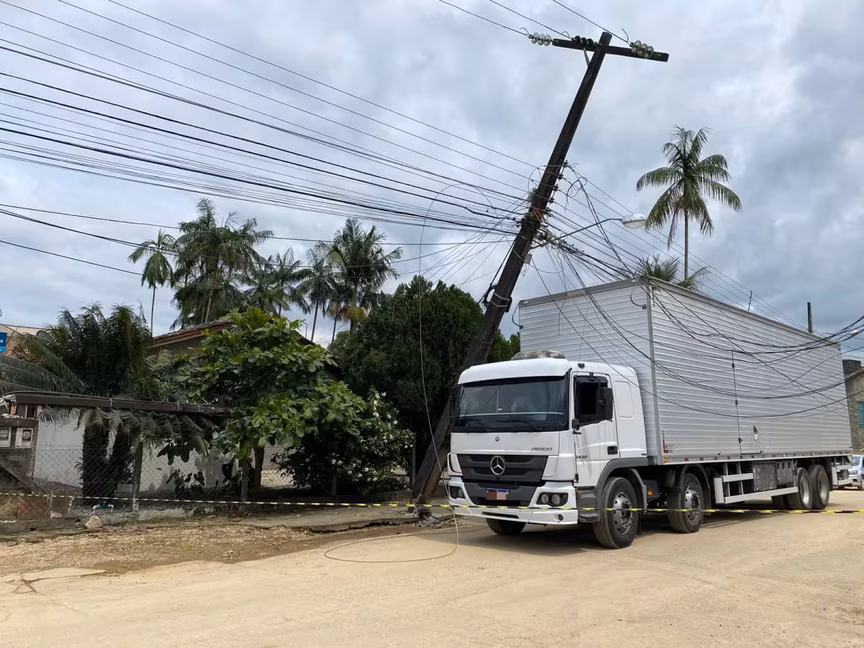 Poste quebra e cai sobre caminhão no Santa Terezinha, em Brusque