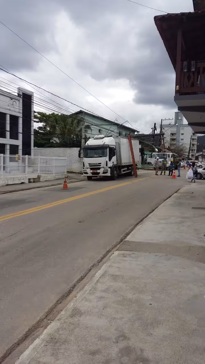 Um poste quebrou ao meio e caiu sobre um caminhão na rua Santa Cruz, no bairro Águas Claras, na manhã desta terça-feira, 10. O caso aconteceu por volta das 10h15.