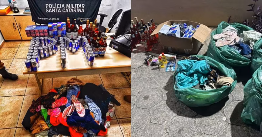 Dentro do carro havia produtos furtados no comércio do município, sendo eles: 102 peças de roupas, seis pares de meias, 51 latas de energético, seis caixas de energético, 50 pacotes de Anil Imperial, 17 garrafas de bebidas e 16 produtos diversos.