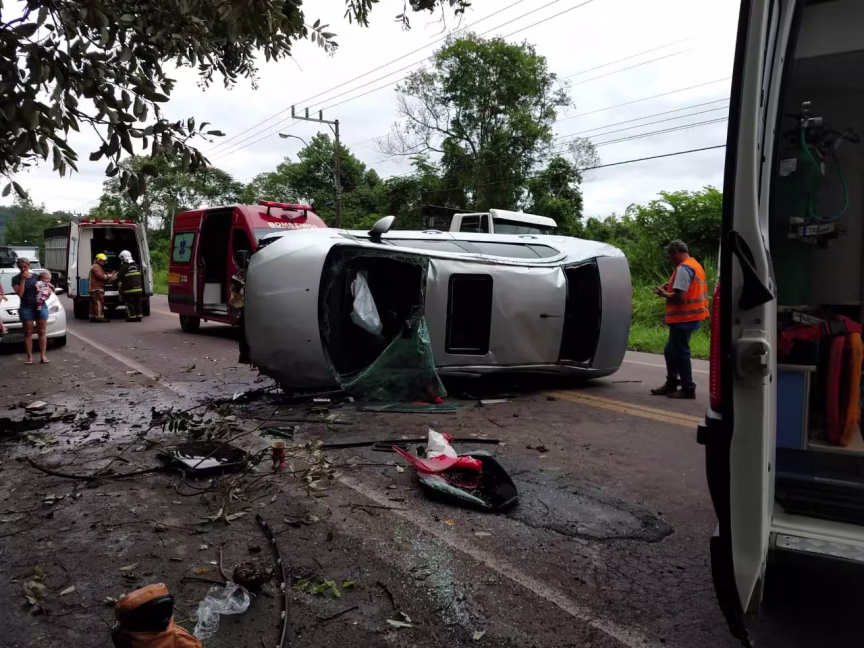 Na manhã desta quinta-feira, 23, um veículo Peugeot 408, com placas de Passo Fundo (RS) saiu da pista, bateu contra uma árvore e capotou no quilômetro 95 da BR-470, em Apiúna.