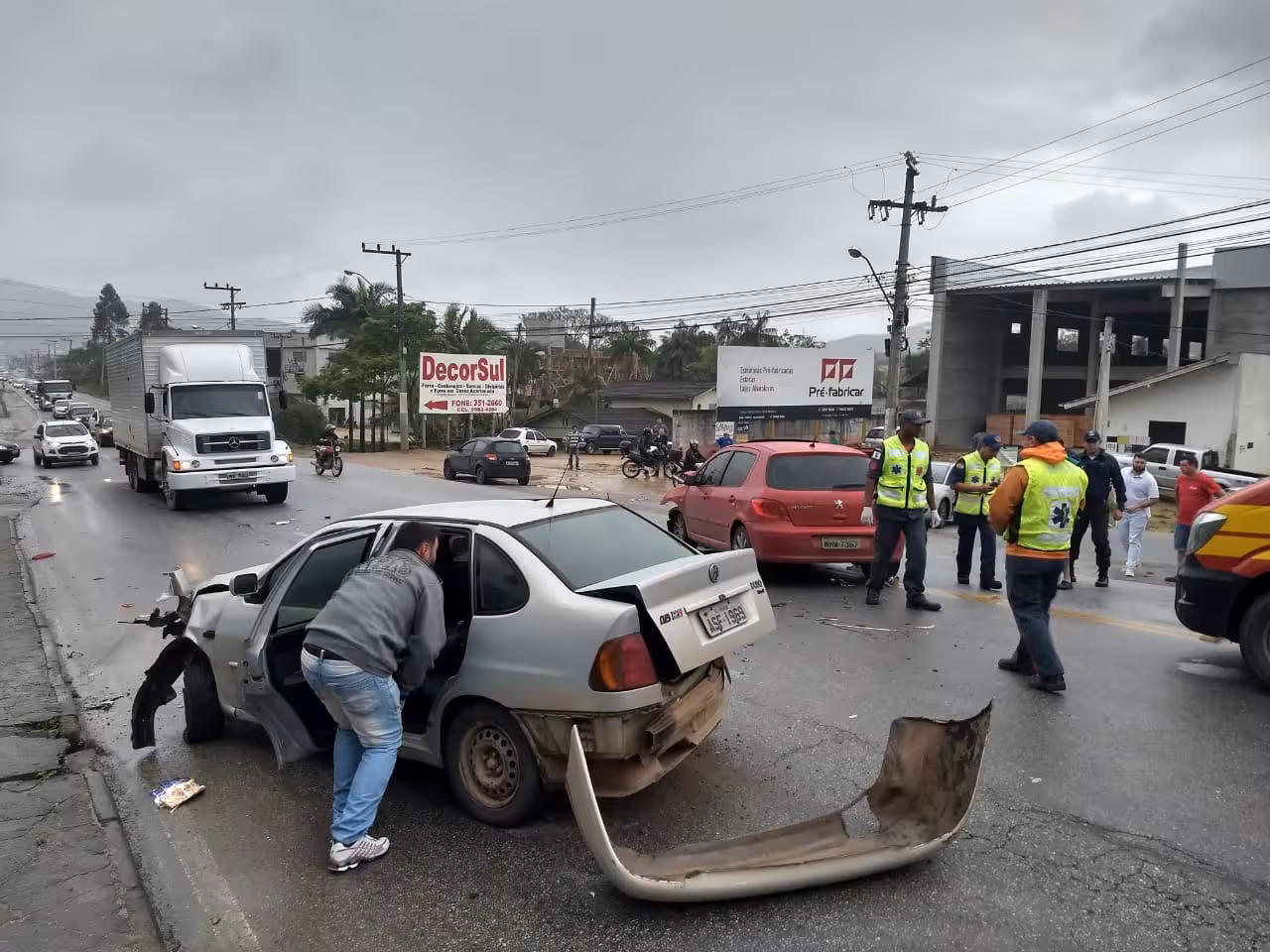 Um Ford Ka preto, um Citroën C4, um Volkswagen Polo prata e um Peugeot 307 vermelho colidiram entre si. Os motoristas, todos homens, têm 38, 30, 36 e 19 anos, respectivamente. A mulher que se feriu levemente estava no banco traseiro do Peugeot 307. Ela teve um corte na boca e foi levada ao pronto socorro do Hospital Azambuja pelo Corpo de Bombeiros.