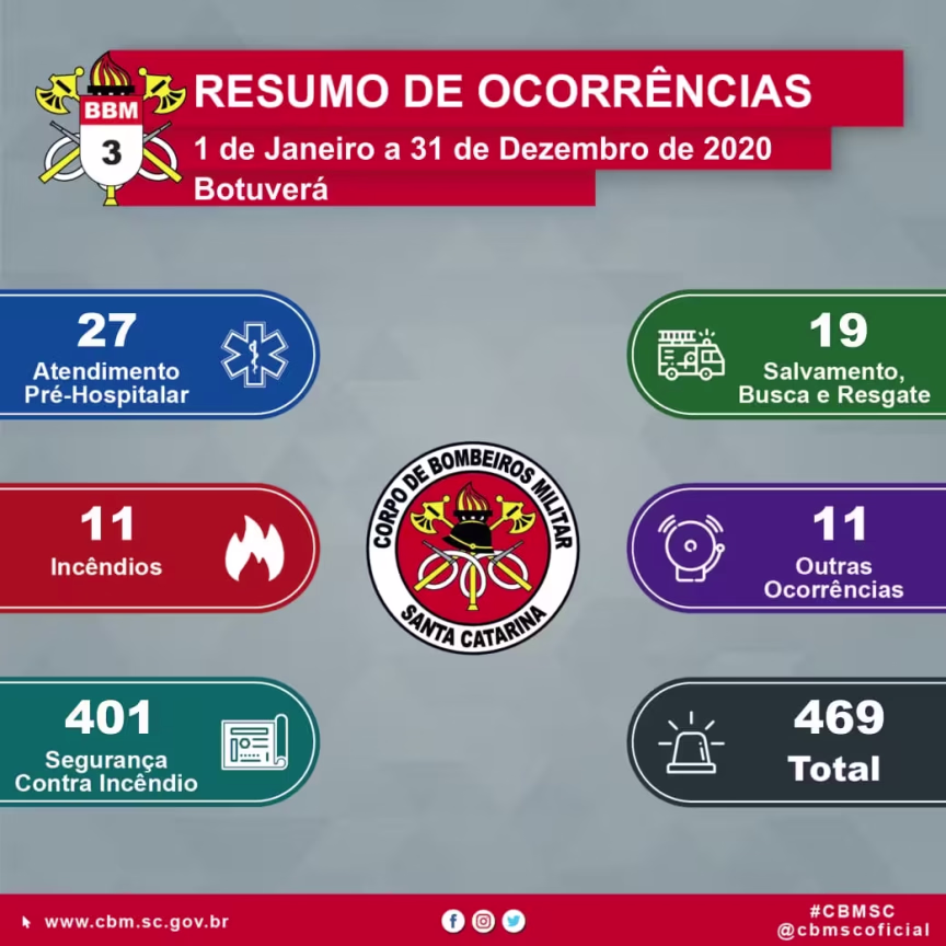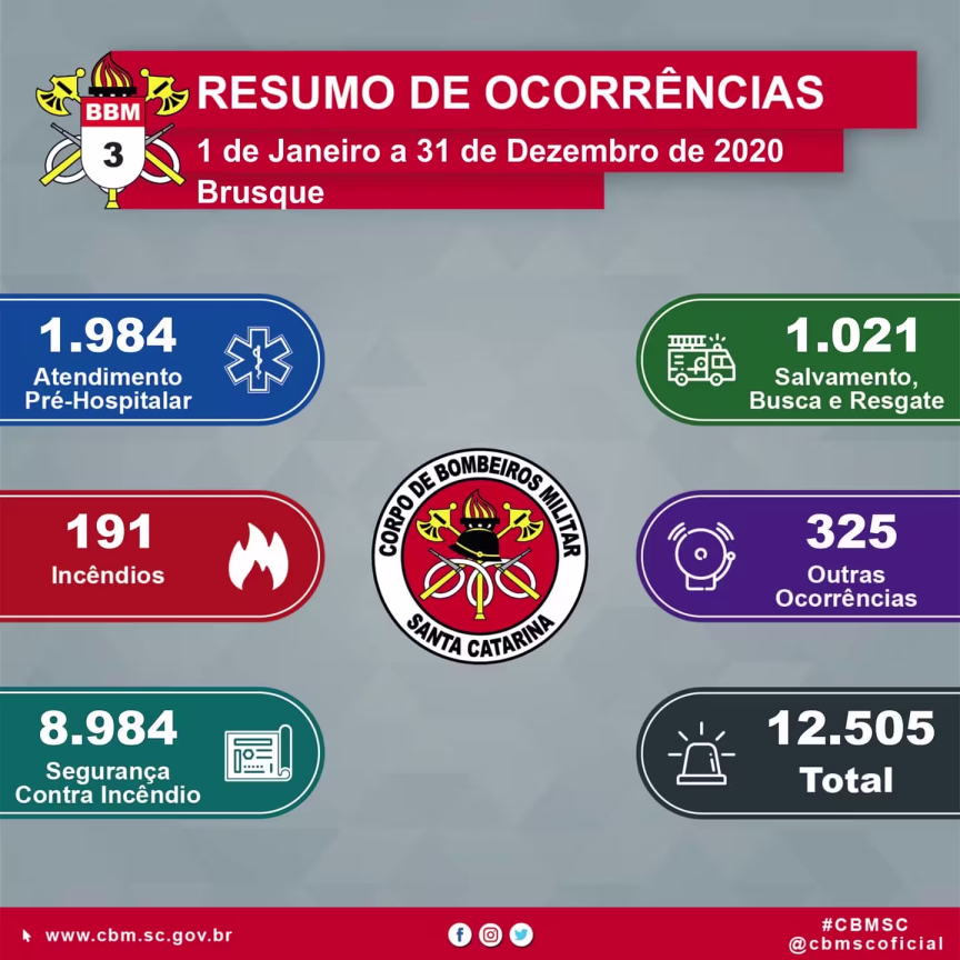 Dados são da 3ª Companhia de Bombeiros Militar, que atende Brusque, Guabiruba e Botuverá; no total, foram 15 mil ocorrência atendidas no ano