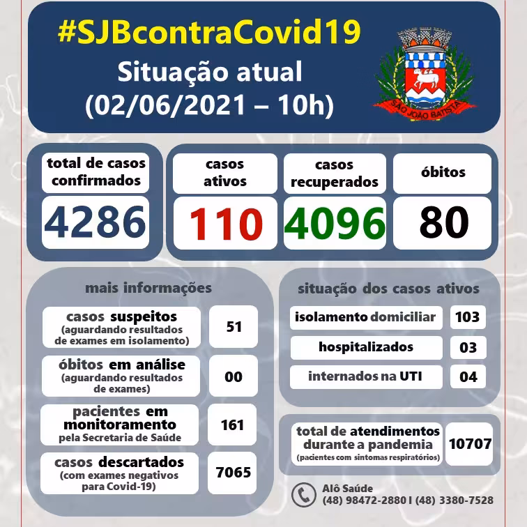 A Prefeitura de São João Batista confirmou novo óbito com diagnóstico positivo para Covid-19, totalizando 80 mortes pela doença no município.