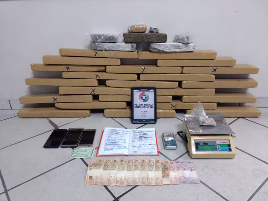 Os policiais de Biguaçu foram até a casa do homem e encontraram 35 quilos de maconha, 50 gramas de ecstasy, R$ 555, duas balanças, sendo uma de precisão e uma tipo de mercado, três celulares e um caderno contendo anotações sobre o tráfico.