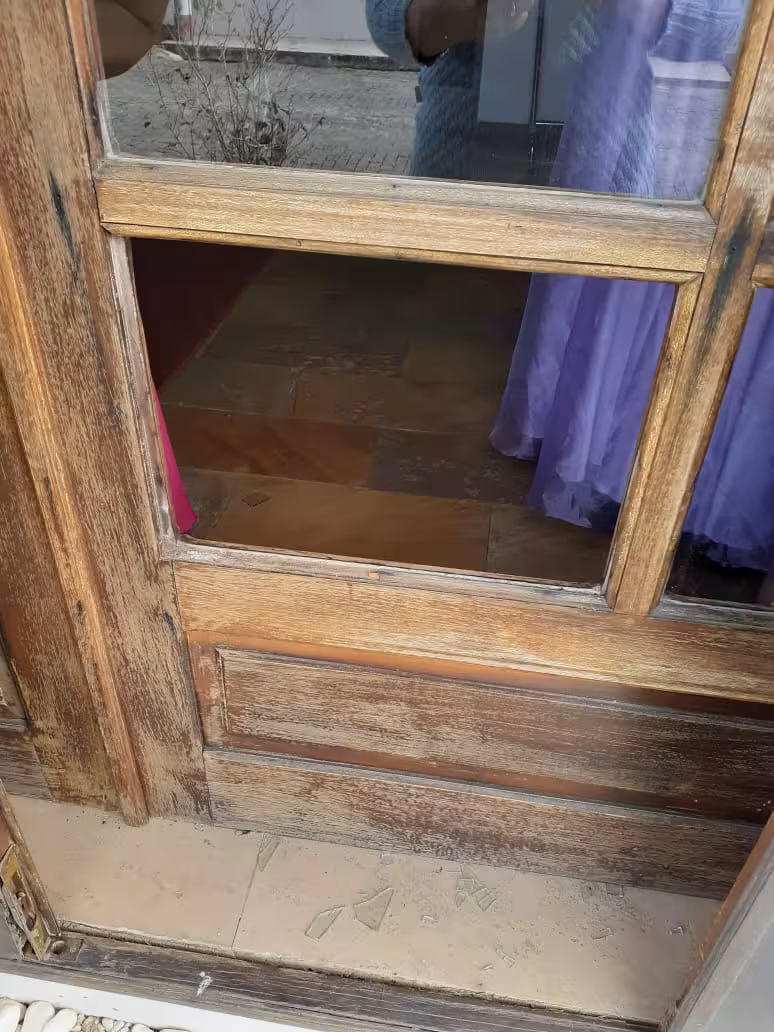 Uma porta do ateliê foi arrombada e o vidro da outra foi quebrado.