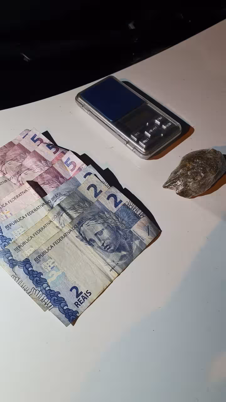Diante da suspeita, a equipe realizou a abordagem e deu ordem aos dois para tomarem posição da revista. Durante busca pessoal, foram localizados no bolso esquerdo da calça do de um deles, um "torrão" de aproximadamente 23 gramas de maconha, bem como uma balança de precisão e a quantia de R$ 31,65.