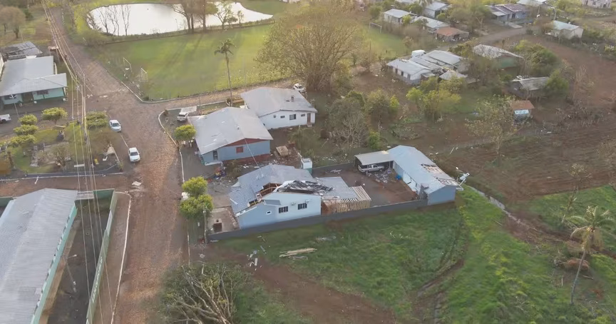 De acordo com relatos locais e imagens de drone fornecidas pela Coordenadoria Regional de São Miguel do Oeste, é possível observar um caminho de destruição, com telhados parcialmente destruídos e árvores tombadas.